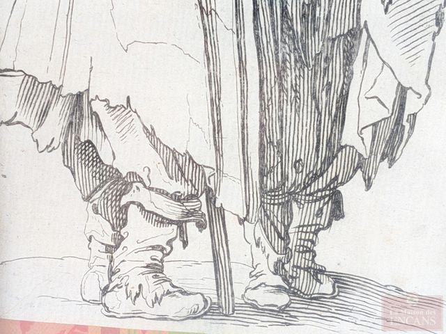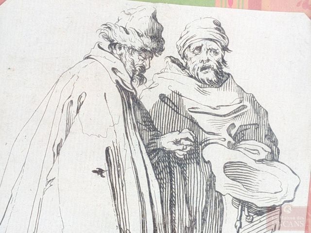 Ancienne gravure sur papier d'une œuvre de Jacques Callot, titrée Les Gueux, datant du 18eme siècle et mesurant 5x3.5 pouces, dans un joli encadrement à la feuille d'or