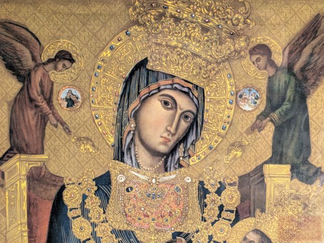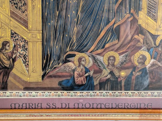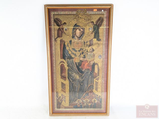 Lot # 155 - Lithographie sur papier d'une icône religieuse italienne, représentant la vierge Maria di Montevergine Noir, aquarellée à la main, datant des années 1940-1950 et mesurant 26x14.5 pouces SOLD