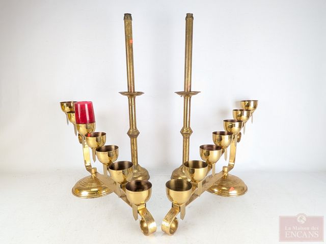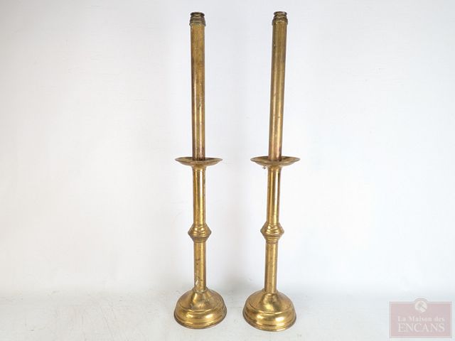 Lot # 9 - Deux brules-cierges d'autel en laiton doré, mesurant 26 pouces de hauteur, ainsi que deux portes-lampions mesurant 30 pouces de hauteur SOLD