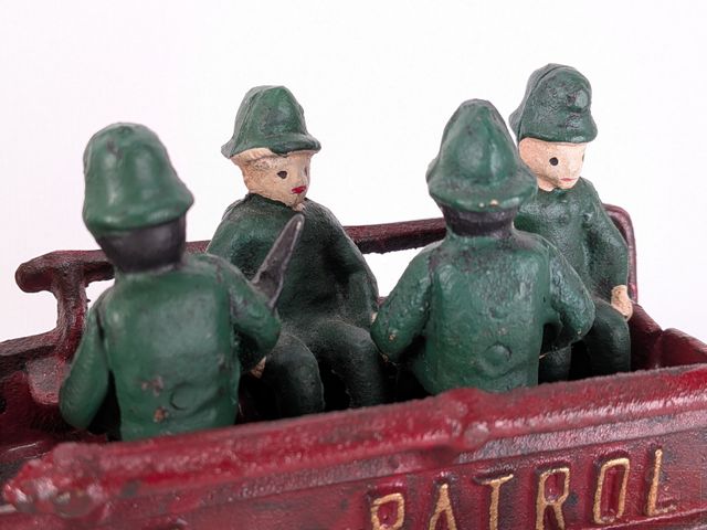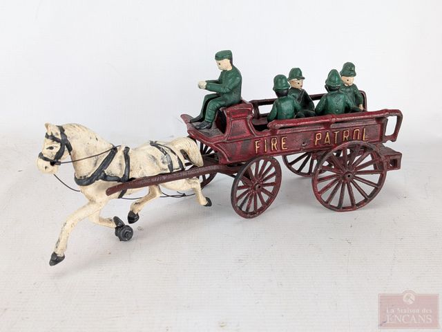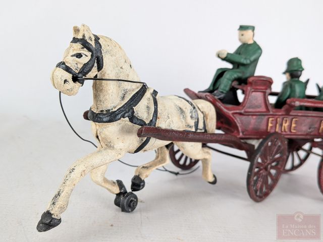 Lot # 26 - Chariot de pompier avec son cheval et personnages amovibles, faits en fonte et mesurant 16 pouces de longueur SOLD