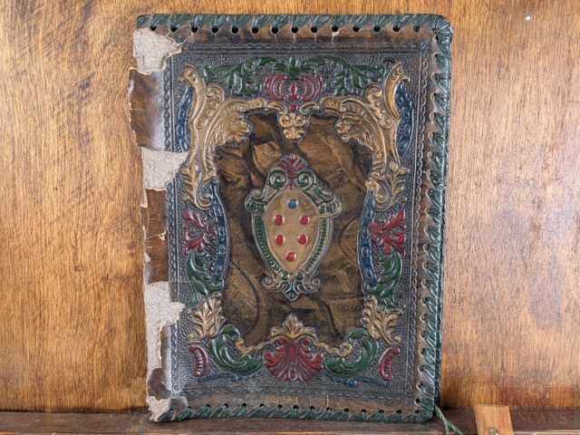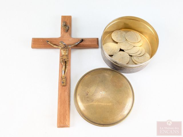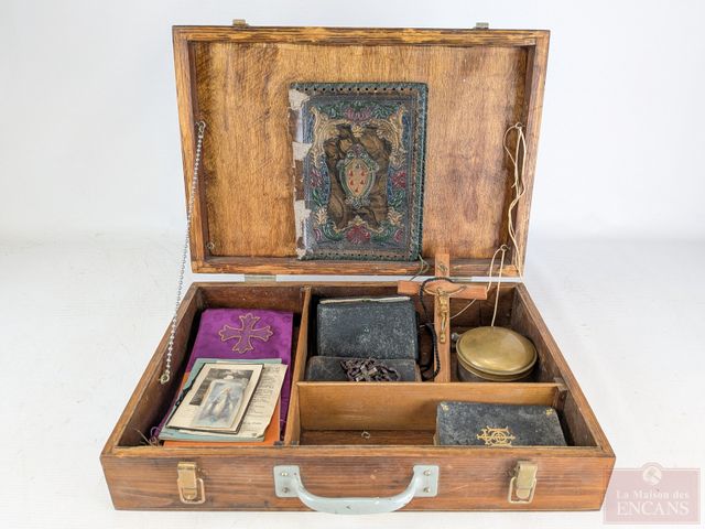 Lot # 10 - Ensemble de voyage comprenant contenant à hosties et divers accessoires nécessaires au derniers sacrements, le coffret mesurant 18 pouces SOLD