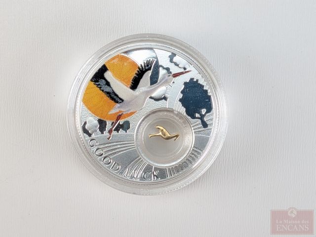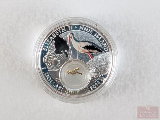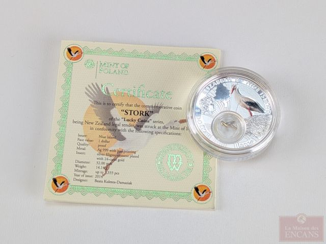 Lot # 79 - Pièce polonaise d'un dollar Niue Island 2014 'Good Luck' en argent pur 999 avec insertion d'oiseau plaqué or 24k, dans sa boite avec certificat, sans taxes SOLD