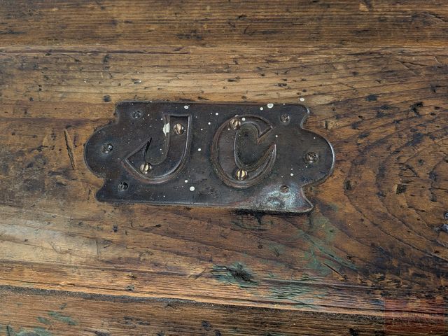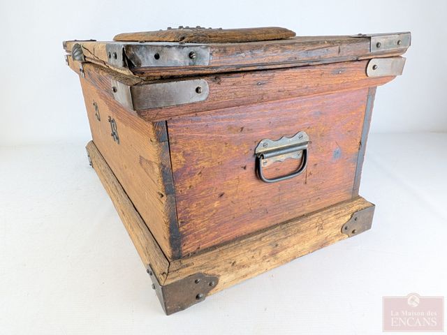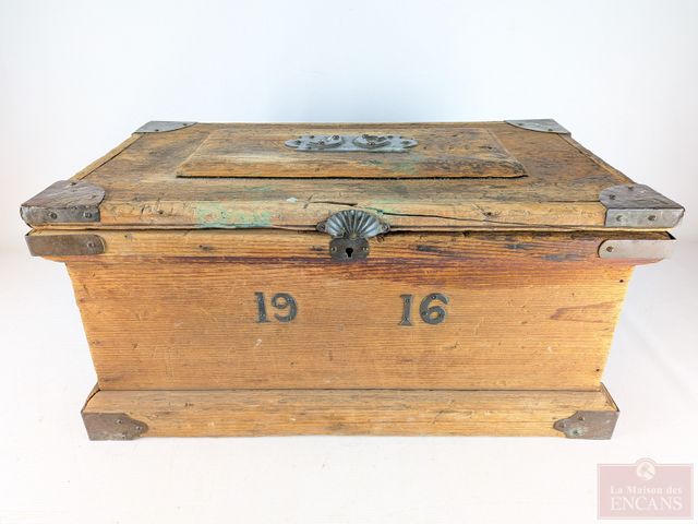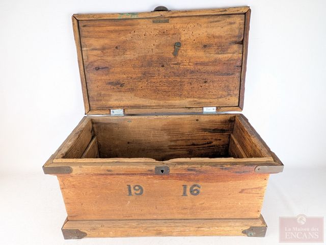 Lot # 16 - Superbe et ancien coffre en bois avec appliques en bronze et pentures d'origines, datant de 1916 et mesurant 25.5x15x13 pouces SOLD