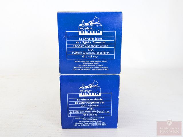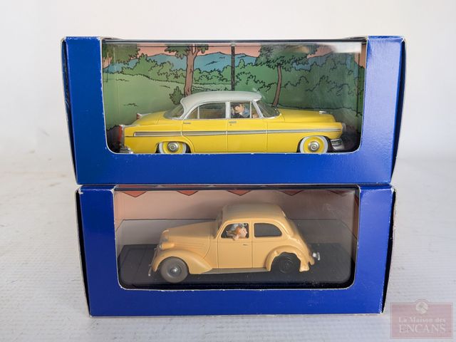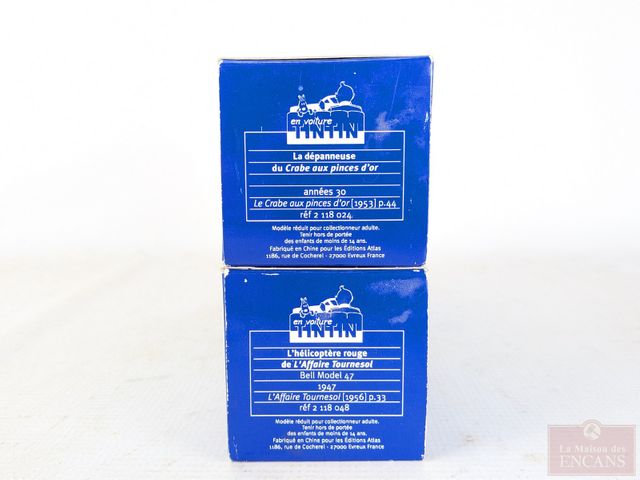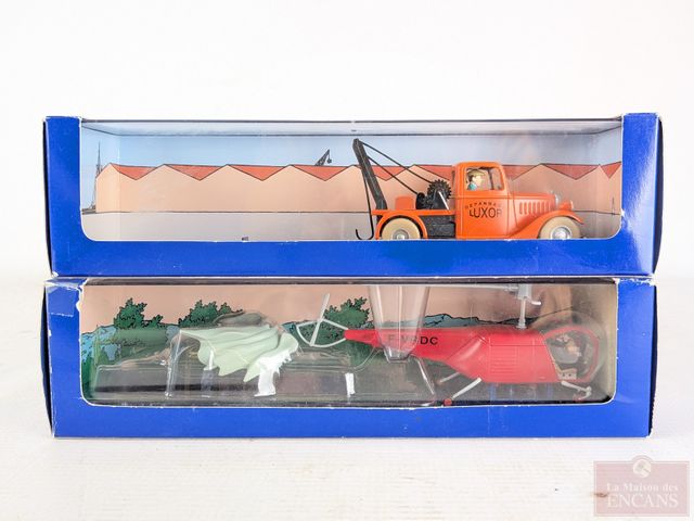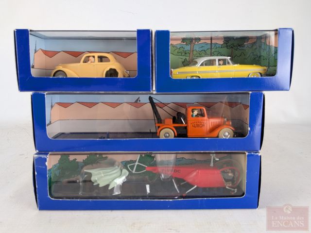 Lot # 184 - Quatre voitures de collection Tintin comprenant la dépanneuse et la voiture accidentée du Crabe aux pinces d'or, l'hélicoptère rouge et la Chrysler jaune de L'affaire Tournesol SOLD