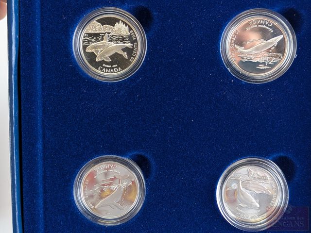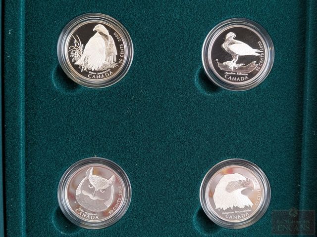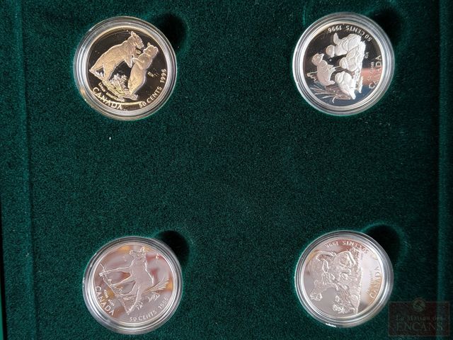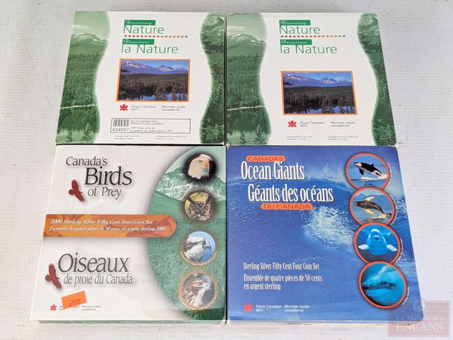 Lot # 147 - Ensemble de quatre coffrets numismatiques canadiens contenant pièces cinquante sous en argent sterling, comprenant Oiseaux de proie du Canada 2000, Géants des océans 1998, Petits de la grande nature 1996 et Les meilleurs amis du Canada 1997 SOLD
