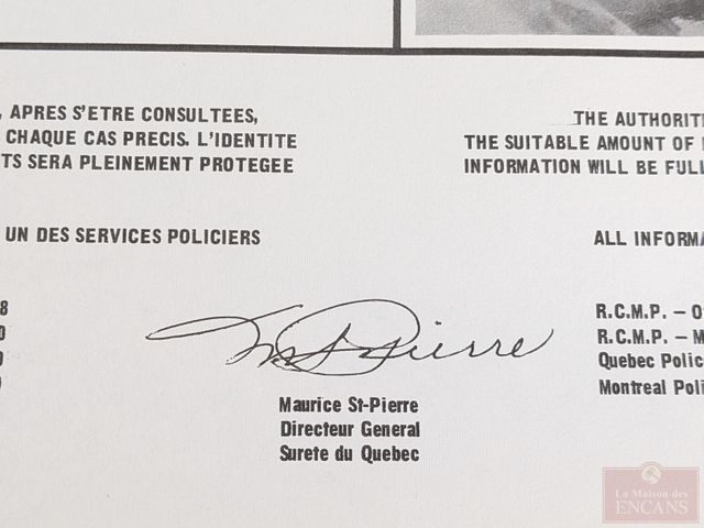 Lot # 46 - Affiche originale récompense pour la capture du FLQ 150 000$ mesurant 20x16 Francis Simard, Marc Carbonneau, frères Rose - datant de 1970 SOLD
