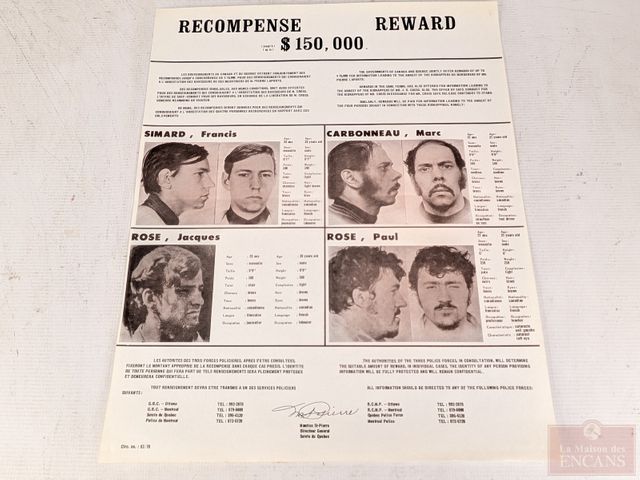 Affiche originale récompense pour la capture du FLQ 150 000$ mesurant 20x16 Francis Simard, Marc Carbonneau, frères Rose - datant de 1970