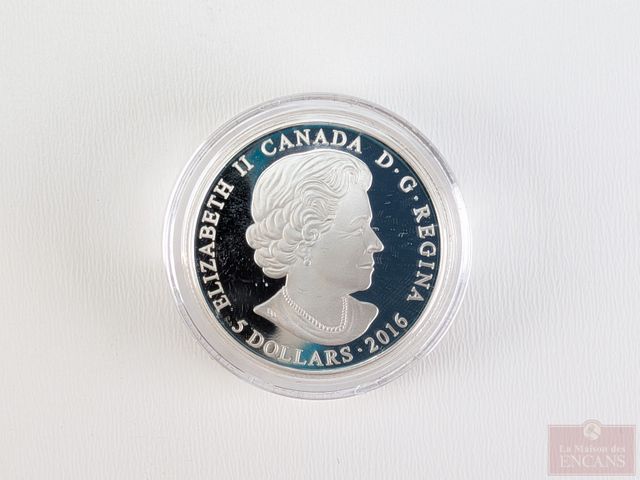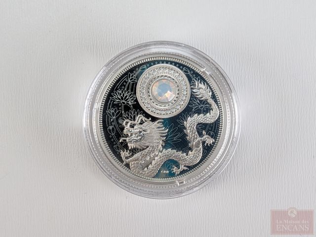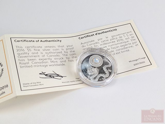 Lot # 94 - Pièce canadienne de cinq dollars 2016 Dragon en argent pur 9999 avec cristal, dans sa boite avec certificat, sans taxes SOLD
