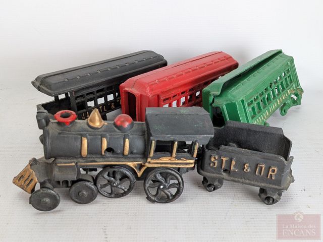 Lot # 149 - Locomotive et wagons en fonte, les wagons mesurant 8.5 pouces de longueur chacun SOLD
