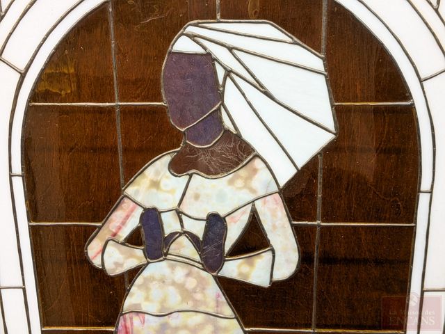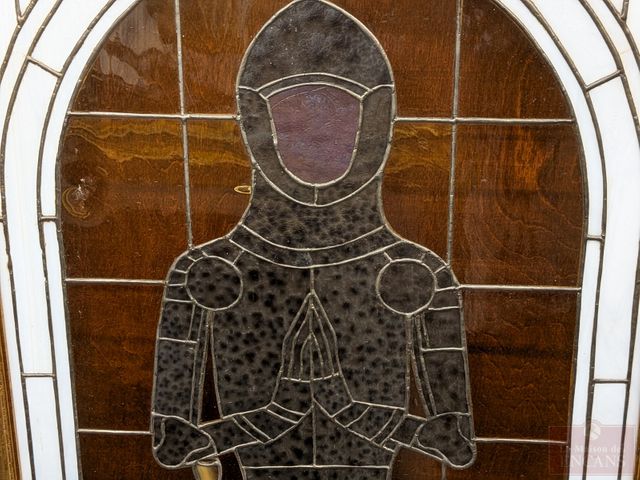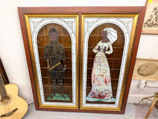 Lot # 38 - Vitrail à vitre plombée de style médiéval, représentant un chevalier et une princesse, dans un encadrement mesurant 50.5x48 pouces SOLD