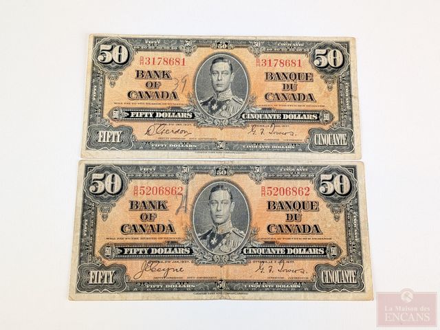 Deux billets de la banque du Canada cinquante dollars 1937 avec signatures différentes