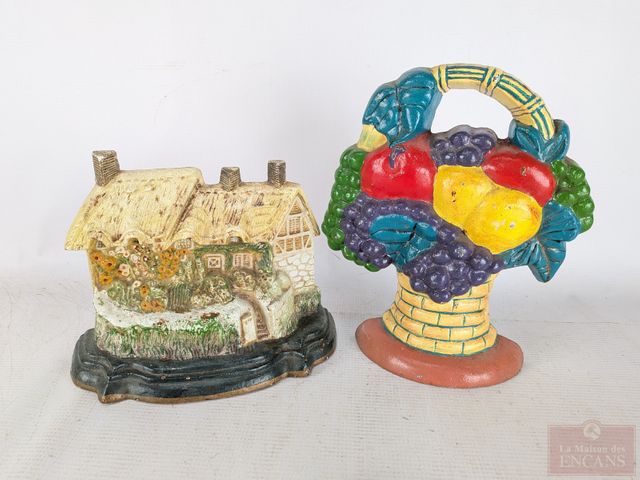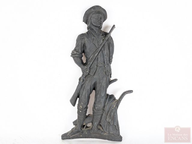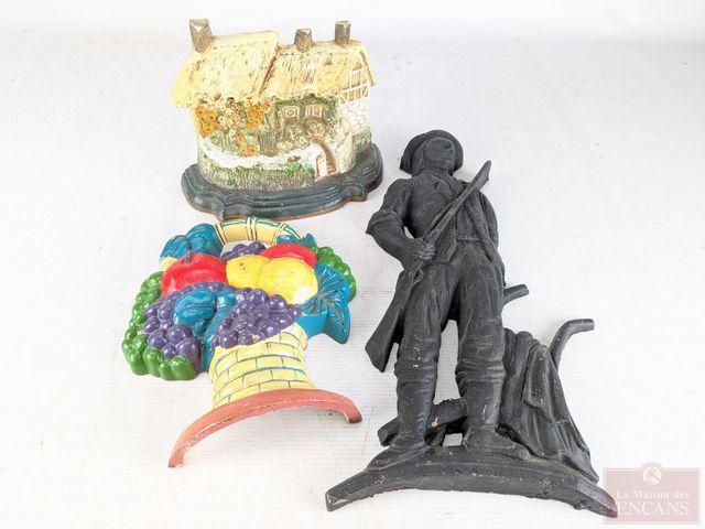 Lot # 138 - Deux arrêtes-portes en fonte, ainsi qu'un patriote en métal mesurant 16.5 pouces de hauteur