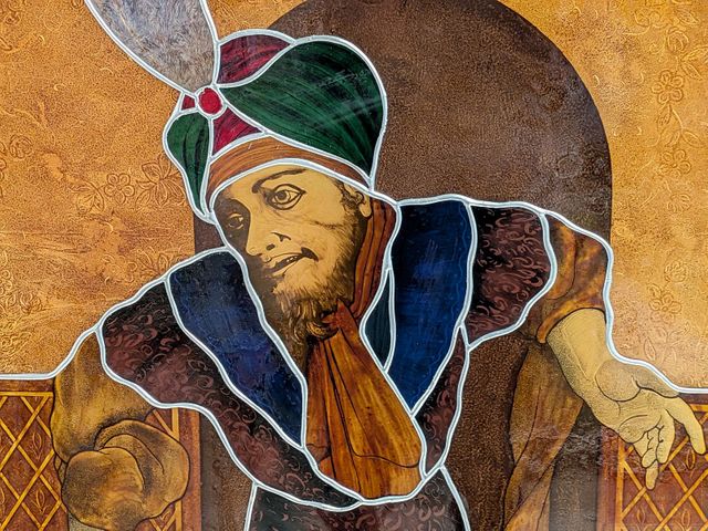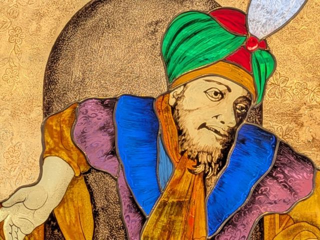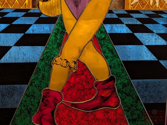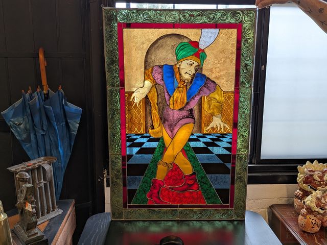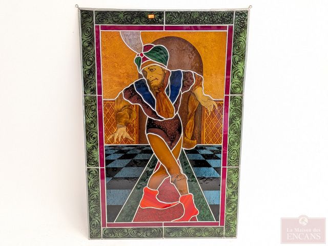 Lot # 14 - Vitrail à vitre plombée représentant un bouffon, mesurant 35.5x23.75 pouces