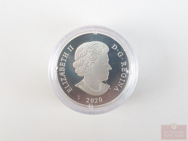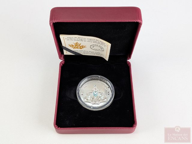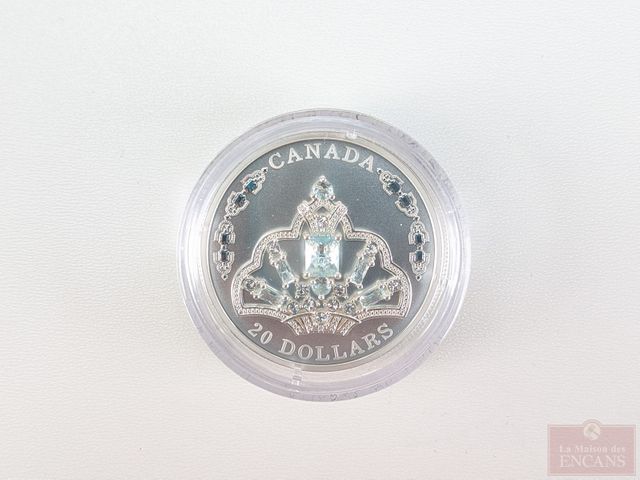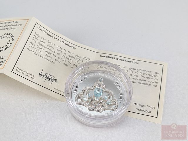 Lot # 186 - Pièce canadienne de vingt dollars 2020 Diadème d'aigues-marines du Brésil et sa majesté la reine Élisabeth II en argent pur 9999, dans sa boite avec certificat, sans taxes
