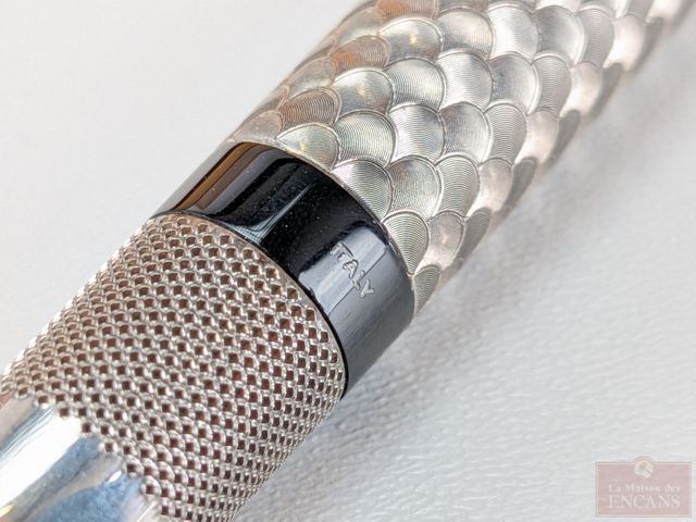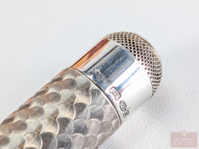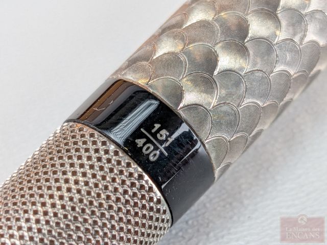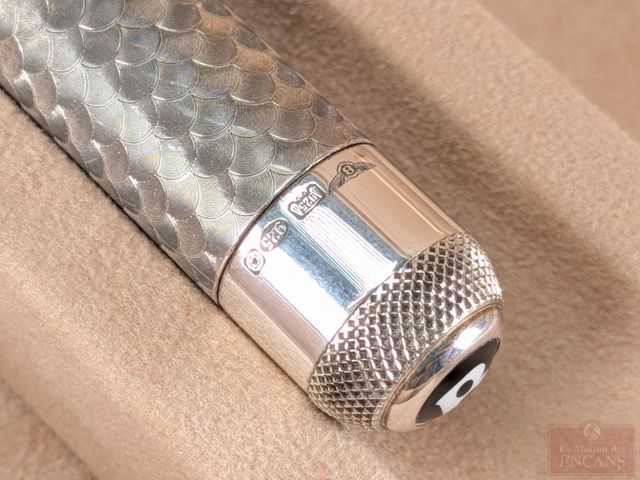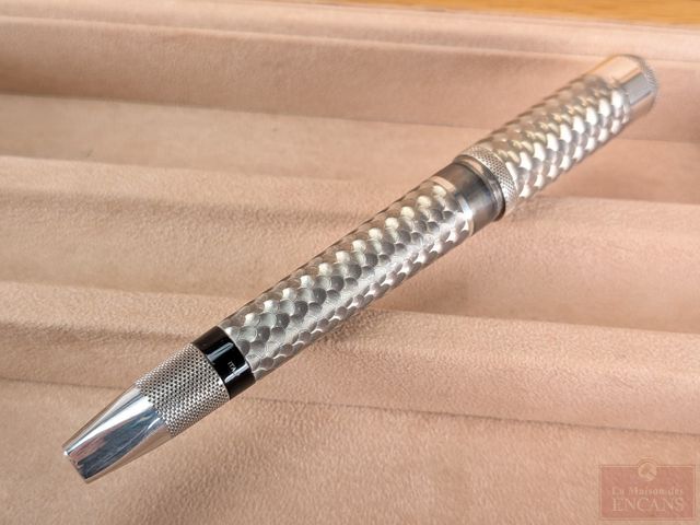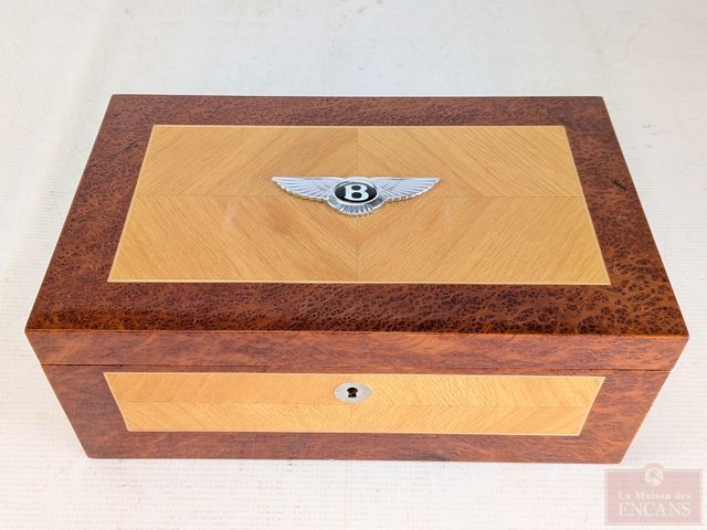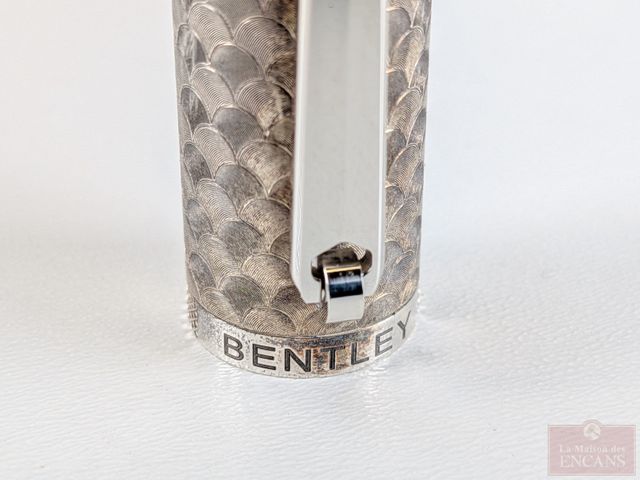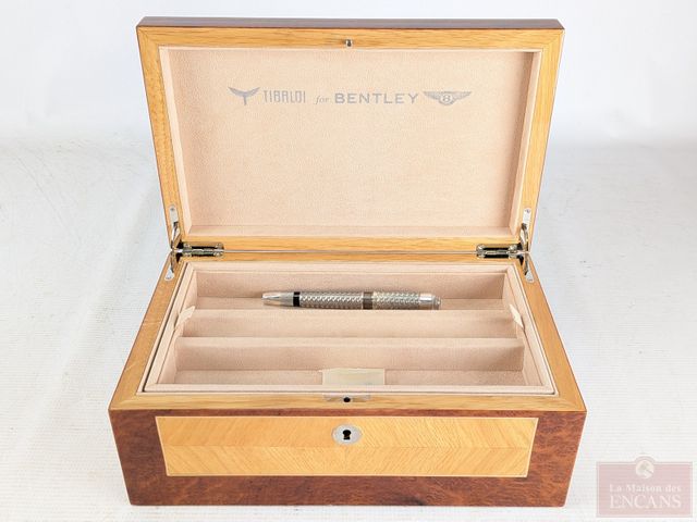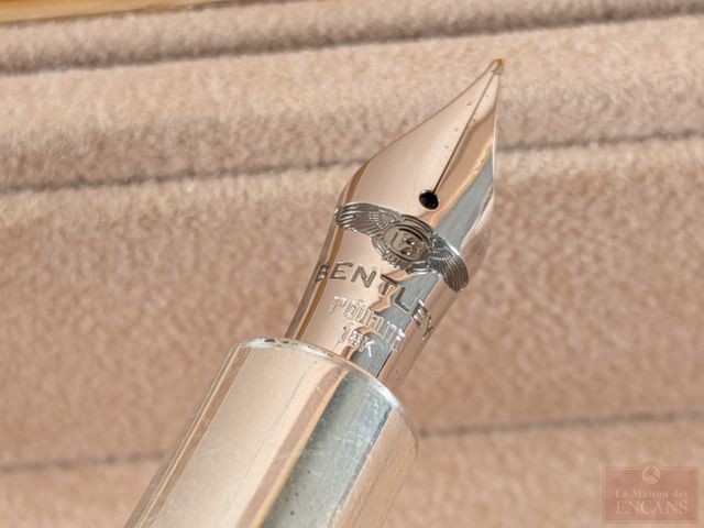 Plume de collection Bentley en argent sterling avec pointe en or 18k, édition limitée numérotée 151 sur 400 avec multiples poinçons, faite par Tibaloi en Italie, dans son coffret en érable piqué mesurant 11.75 pouces, avec sa clef