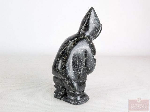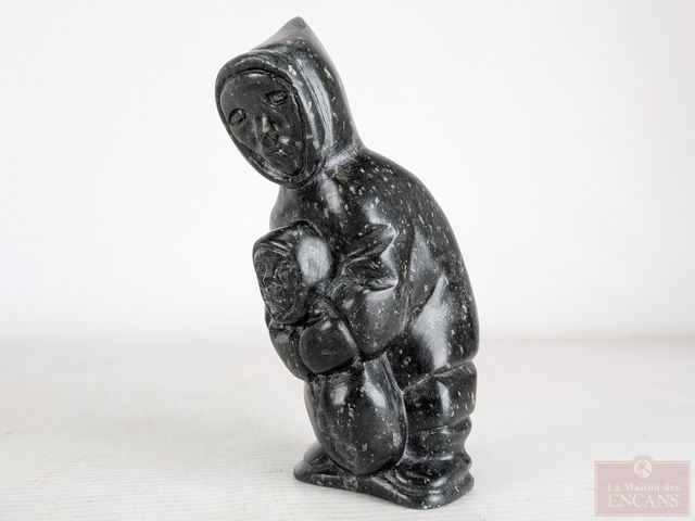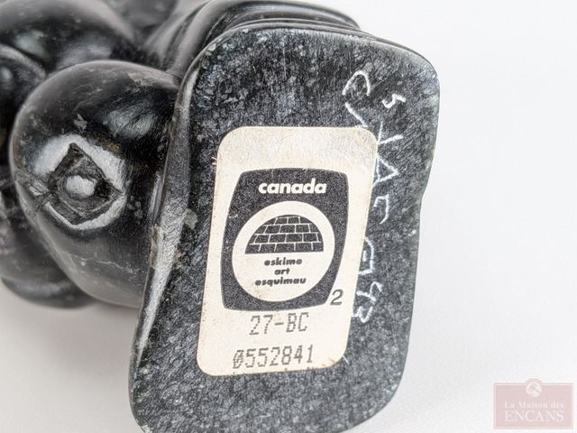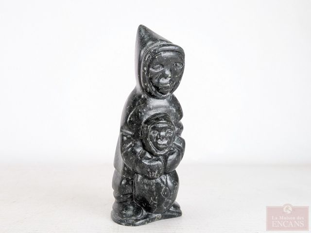 Lot # 64 - Sculpture inuite sur pierre à savon, signée, représentant une mère et son enfant et mesurant 5.5 pouces de hauteur, avec son étiquette