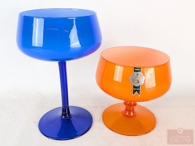 Deux verres soufflés à la main, faits en Italie et datant des années 1970, le plus grand mesurant 8.5 pouces de hauteur