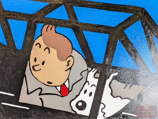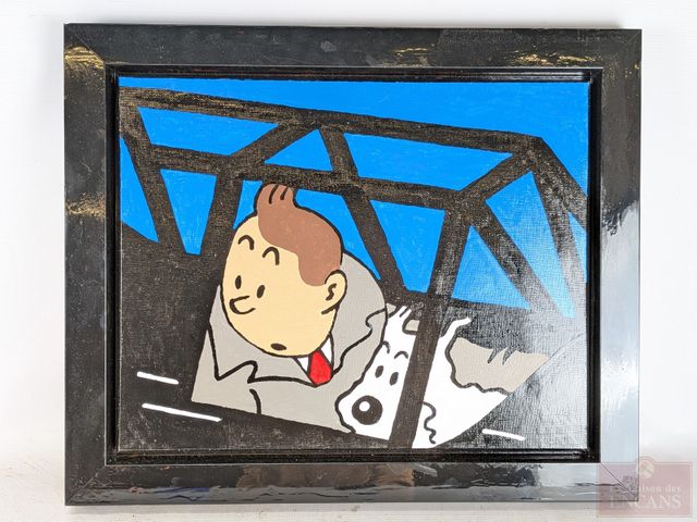 Lot # 153 - Huile sur toile représentant Tintin et Milou en avion, mesurant 15.5x20 pouces