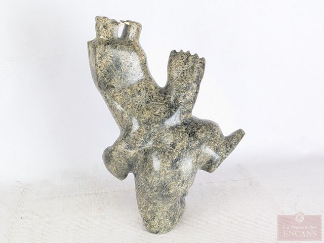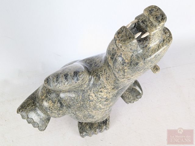 Lot # 114 - Johnny MANNING- Exceptionnelle sculpture inuite (époque Esquimaude) sur pierre à savon, signée, représentant un ours polaire dansant et mesurant 14 pouces de hauteur