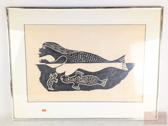 Lot # 8 - Kootoo NUNNO - Estampe inuite signée et numérotée à la mine, épreuve d'artiste, représentant la déesse Sedna, datant de 1981, mesurant 14.5x22 pouces et titrée Sea Family