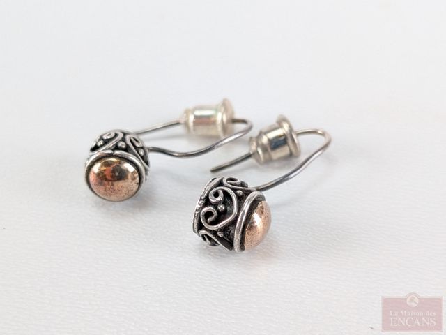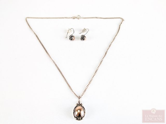Lot # 226 - Ensemble de bijoux en argent sterling et or, comprenant chaine, pendentif et paire de boucles d'oreilles, la chaine mesurant 16 pouces de longueur