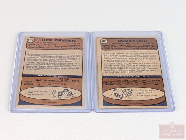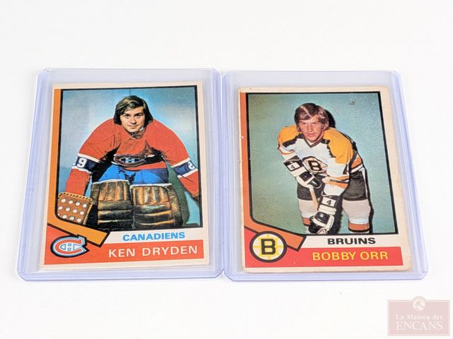 Deux cartes O.P.C. 1974-75 Bobby Orr #100 et Ken Dryden #155, en belle condition