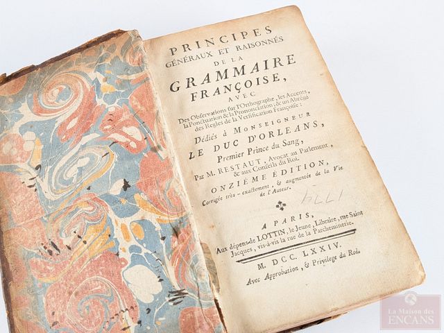 Lot # 190 - Livre ancien Principes généraux et raisonnés de la grammaire françoise, datant de 1774 et mesurant 6.75 pouces