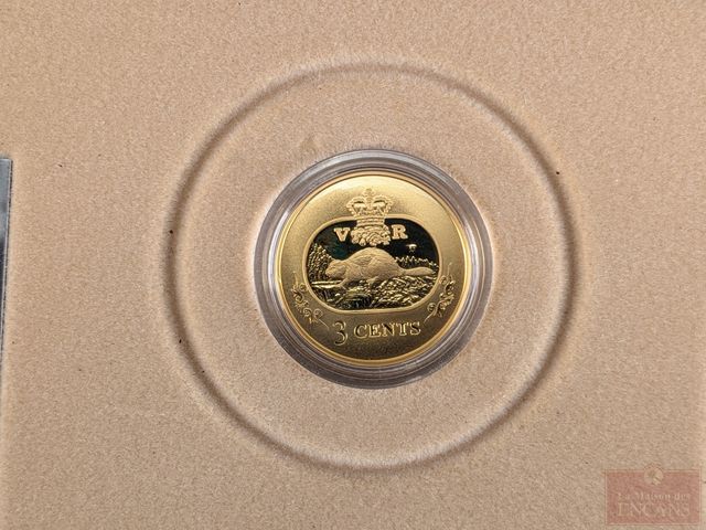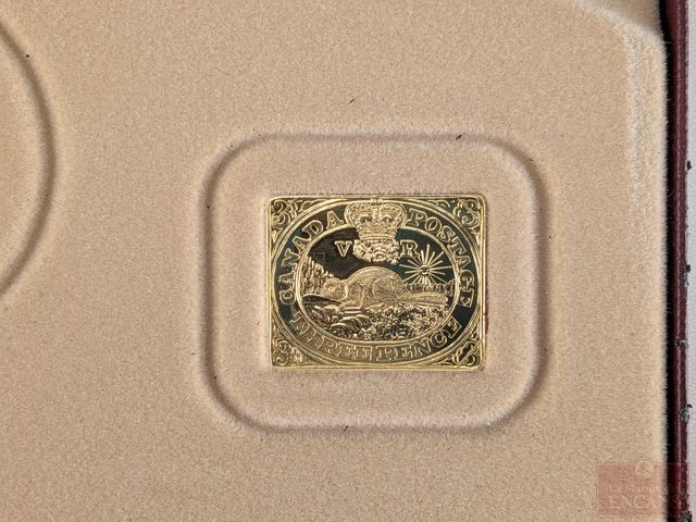 Lot # 232 - Pièce canadienne de trois sous en argent sterling plaquée or 24k, avec timbre, dans son coffret avec certificat SOLD
