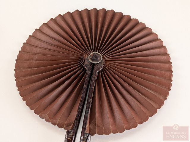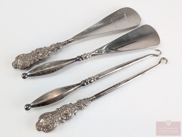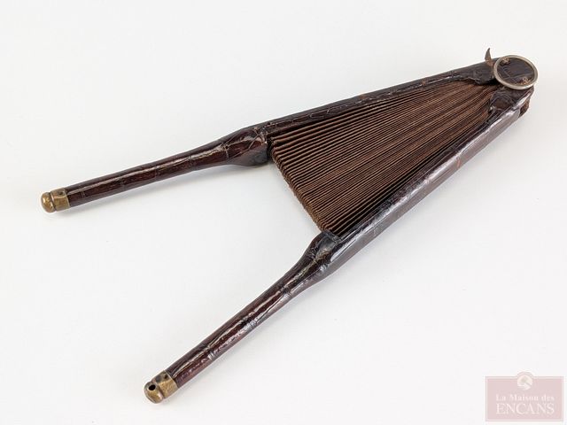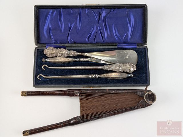 Lot # 231 - Ancien ensemble de chausse-bottes et tire-lacets avec poinçons, faits en Angleterre, ainsi qu'un ancien éventail en cuir d'alligator, mesurant 9 pouces de hauteur SOLD