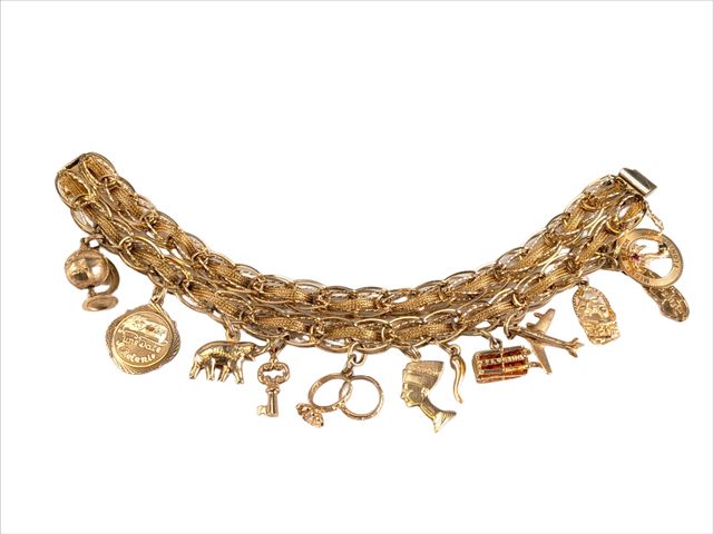 Lot # 119 - Bracelet en or 10k avec breloques en or 10k et deux breloques en or 14k, le bracelet mesurant 8 pouces de longueur SOLD