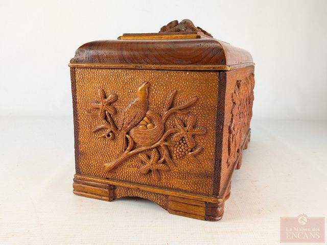 Superbe coffre art-populaire sculpté sur bois de pin, circa 1940, mesurant 16 pouces de largeur