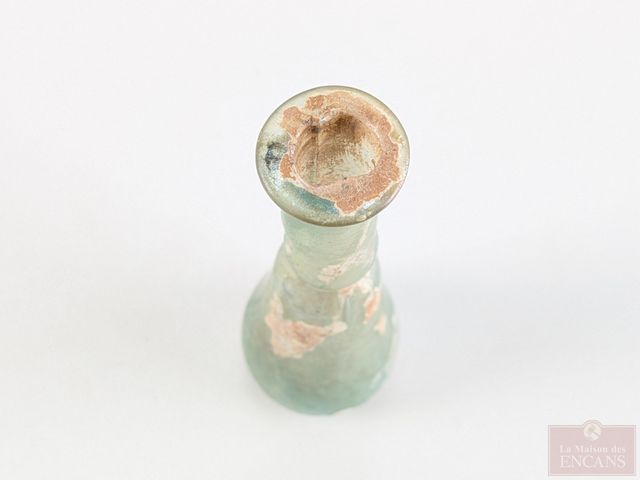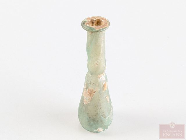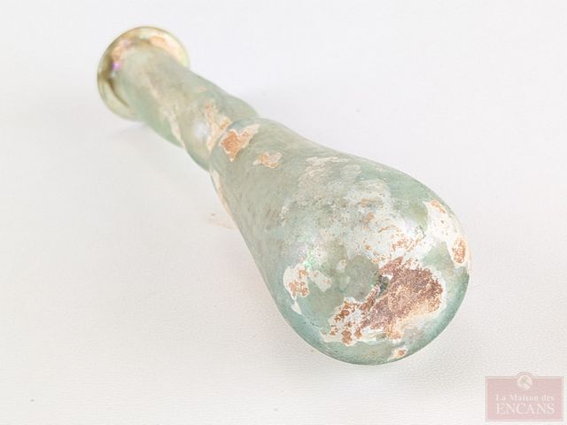 Lot # 201 - Ancienne bouteille romaine lacrimoire de pleureuse en verre soufflé, datant d'approximativement 1 800 ans et mesurant 3.5 pouces SOLD