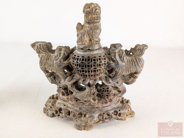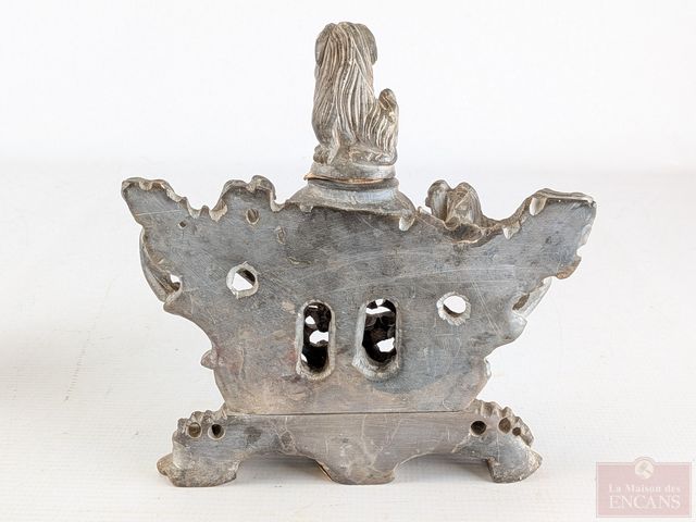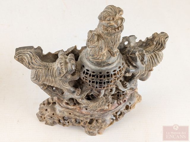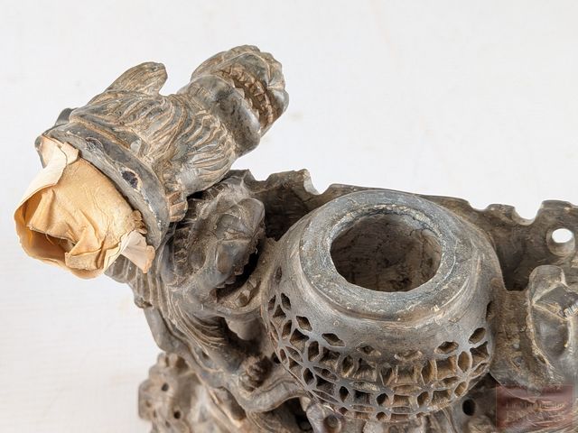 Lot # 20 - Encrier oriental sculpté sur pierre avec motif de foo-dog, mesurant 8 pouces de hauteur