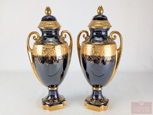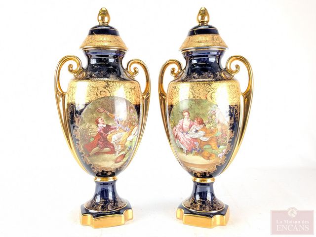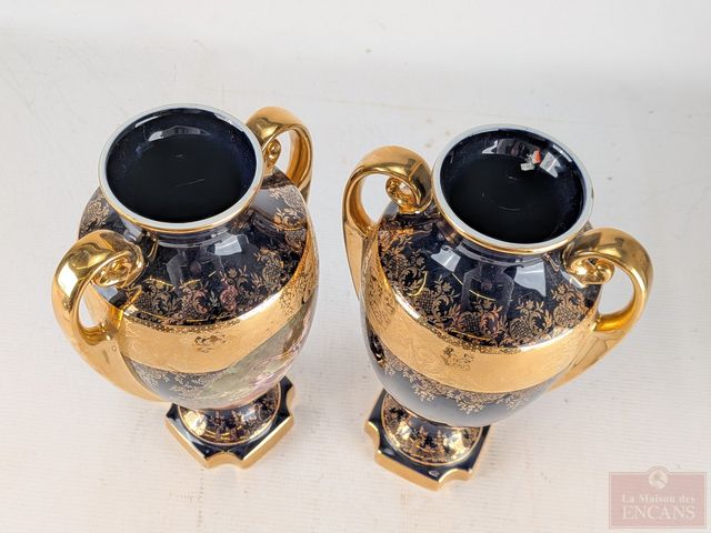 Deux porcelaines de Limoges avec peinture d'or 22k, collection Imperia ornées d'œuvres de Fragonard, mesurant 15 pouces de hauteur chacune