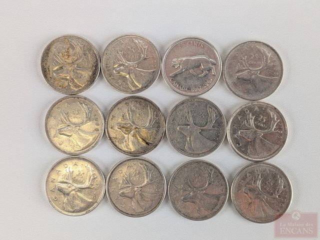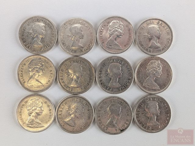 Lot # 199 - Lot de pièces canadiennes de vingt-cinq sous en argent, comprenant 1953, 1955, 1956, 1957, 1959, 1961, 1962, 1963, 1964, 1965, 1967, 1967 SOLD
