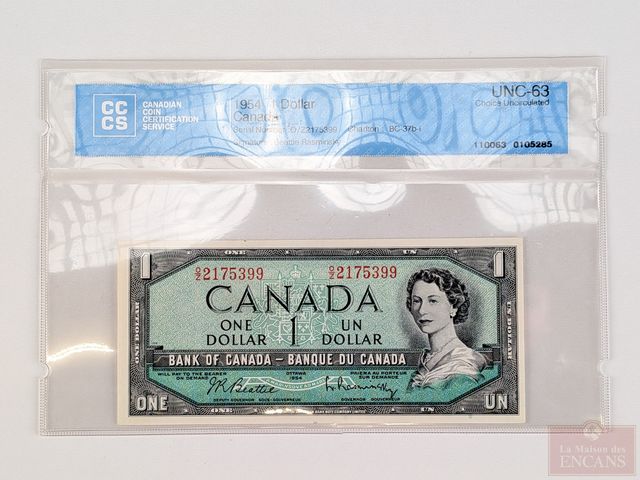 Billet canadien d'un dollar 1954, incirculé et gradé
