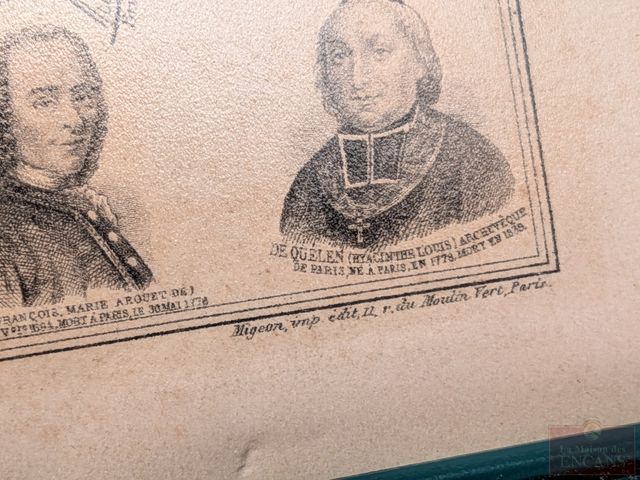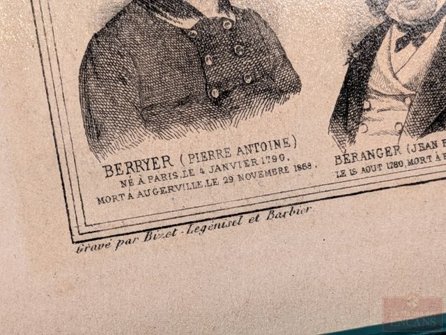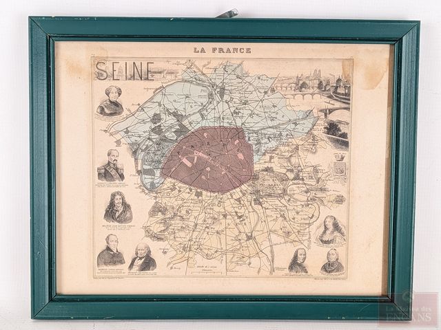Lot # 141 - Ancienne eau-forte aquarellée, représentant une carte de Paris avec effigies de personnages historiques célèbres, datant de 1880 et mesurant 8.5x10 pouces SOLD