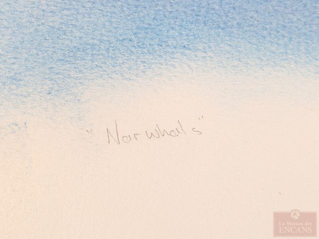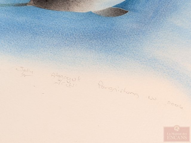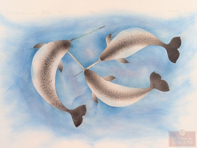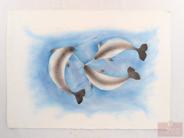 Lot # 166 - Très joli 'stencil' inuit signé et numéroté 28/30, avec couleurs extrêmement vives, représentant des narvals dansant, mesurant 25x18 pouces et titré Narwhals, avec sa provenance et en très bonne condition SOLD