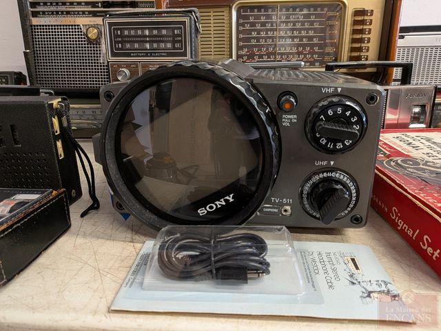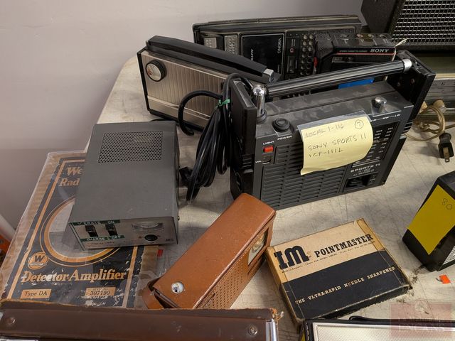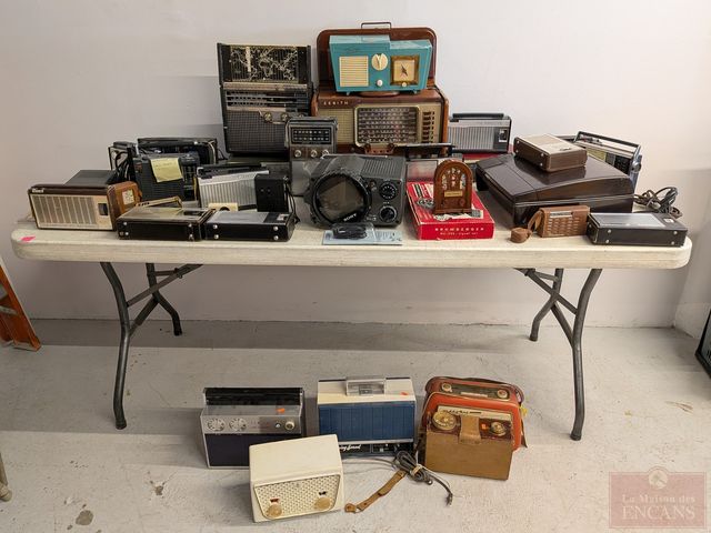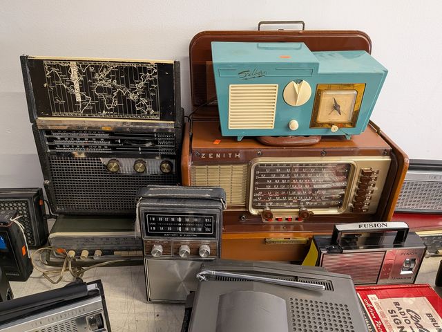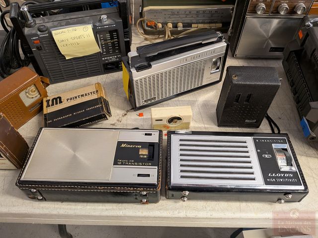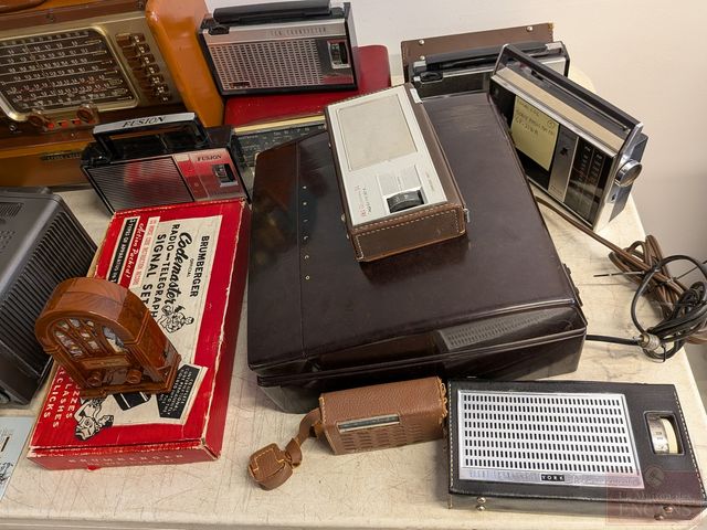 Gros lot de radios et appareils vintages, dont un téléviseur Sony, ensemble de communication en code morse Brumberger, tourne-disque Philco, enregistreur-cassette Viking, radio Normende Transista Royale et radio Zenith Transocéanique