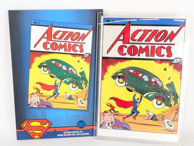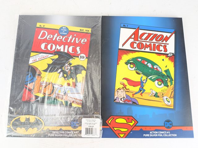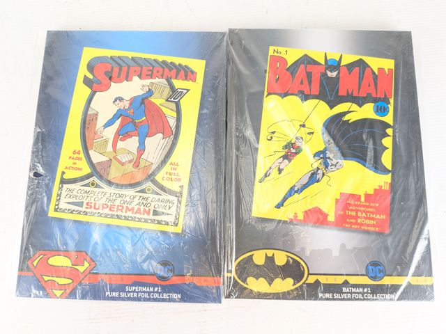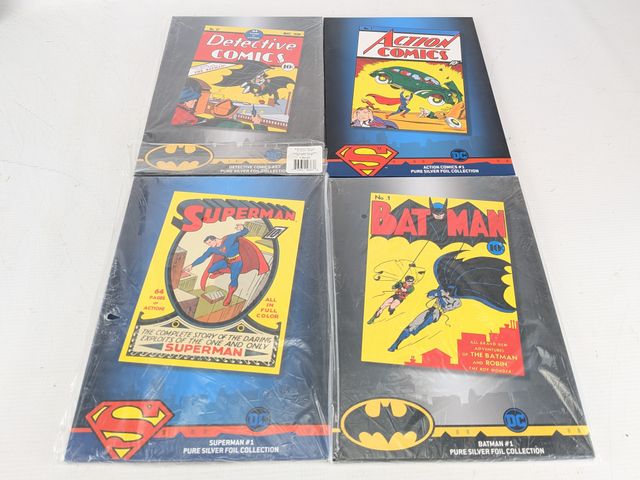 Lot # 190 - Quatre couvertures de comics DC en argent pur 999 pesant 35g chacune produit par la New Zealand Mint. Trois encore scellés. Comprenant Action Comics #1; Detective Comics #1; Superman #1 et Bat Man #1. Mesurant approximativement 10x7 pouces