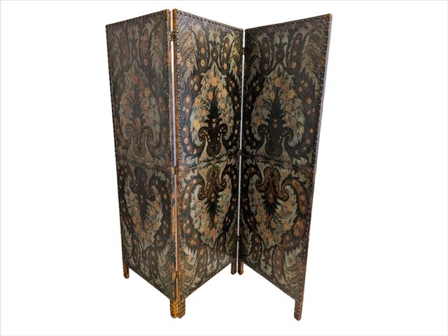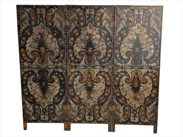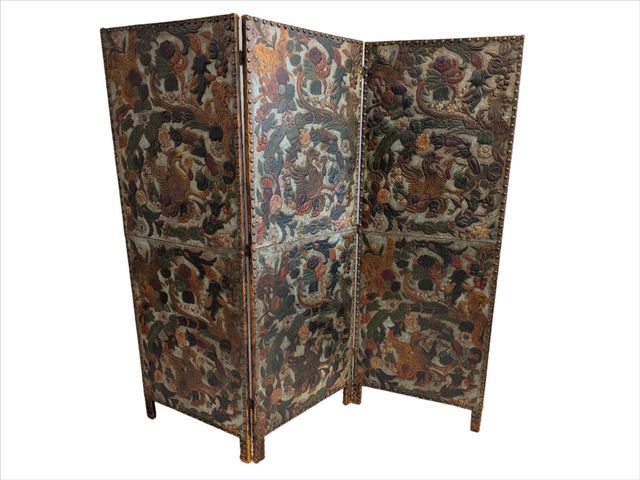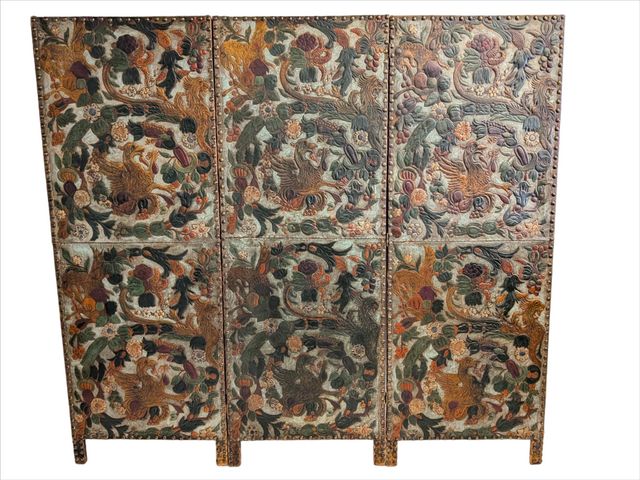 Lot # 179 - Ancien paravent espagnol datant du 19e siècle en cuir de Cordoue peint à la main et bois– chaque panneaux mesurant 63,5 par 23 pouces