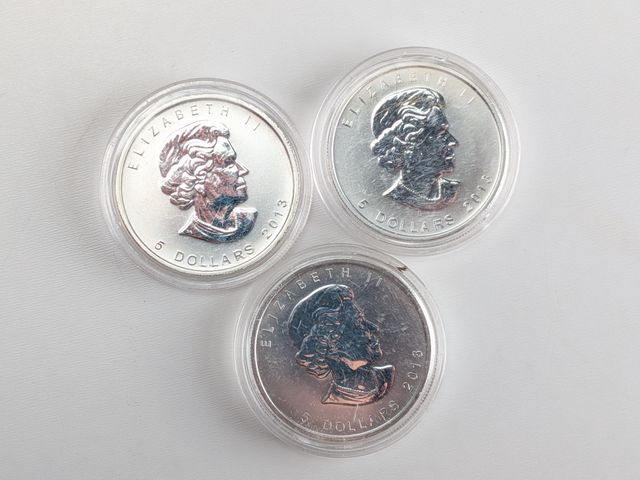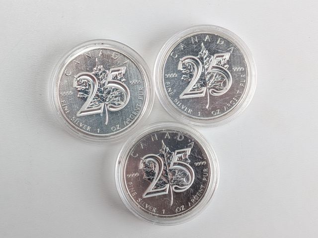 Lot # 178 - Trois pèces de 1 oz d’argent pur 9999 de 5$ canadiens 2013 vingtcinquième anniversaire – encapsulées – sans taxes