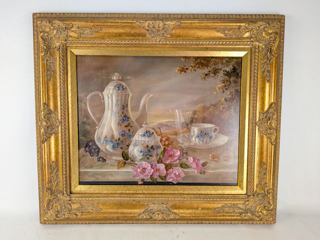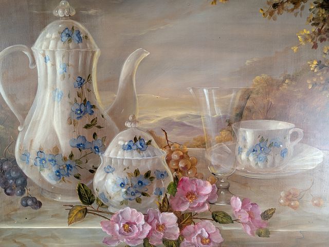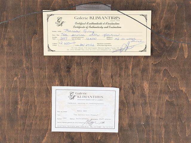 Lot # 97 - Maria GREY - Huile sur panneau signée – Tea Service with flowers – 16x20 pouces