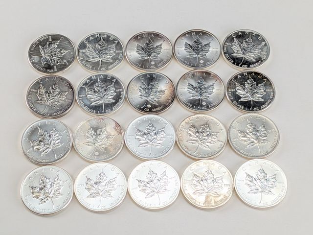 Lot # 200 - 20 pièces de 5 dollars canadiens – Onces d’argent pur 9999 sans taxes – 4x2007 – 2x2011 – 3x2012 – 6x2013 – 2x2014 – 3x2016