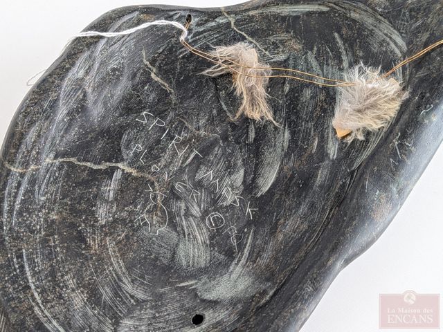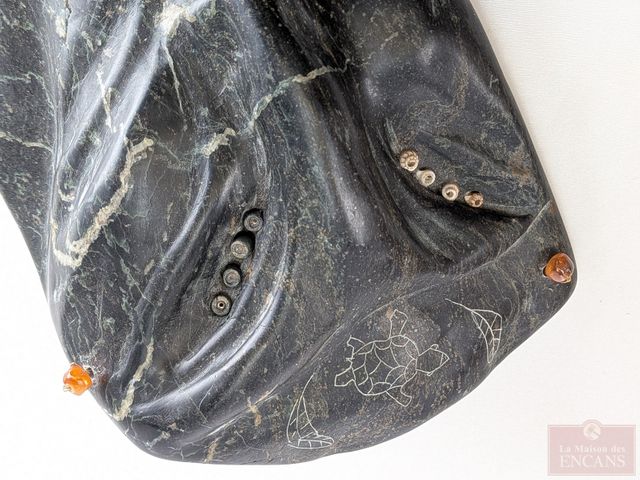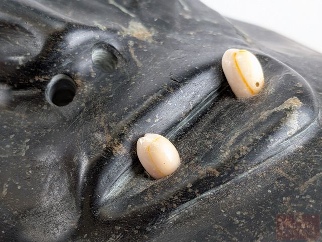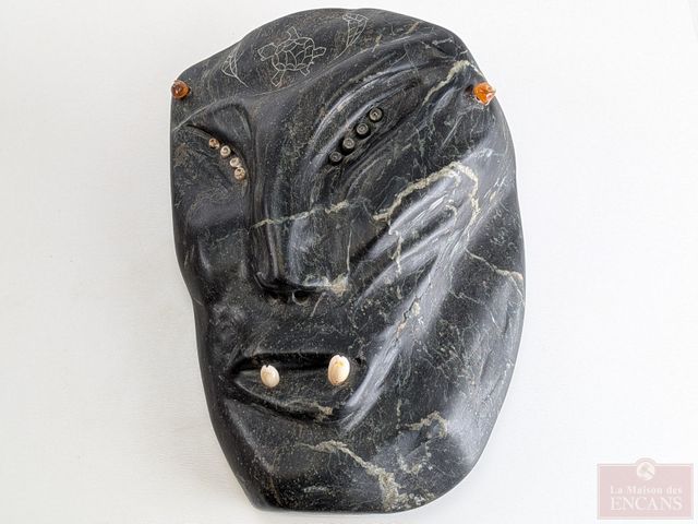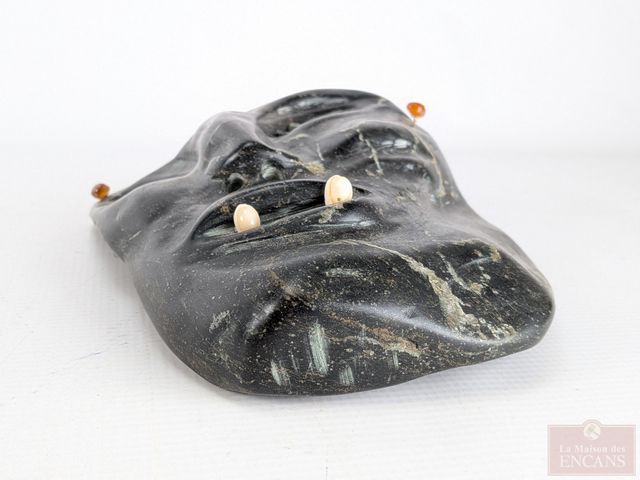 Lot # 24 - Sculpture autochtone sur pierre à savon signée avec incrustations d’ambres et de coquillage – Spirit Mask – Plover – PQ mesurant 9,5 pouces de hauteur