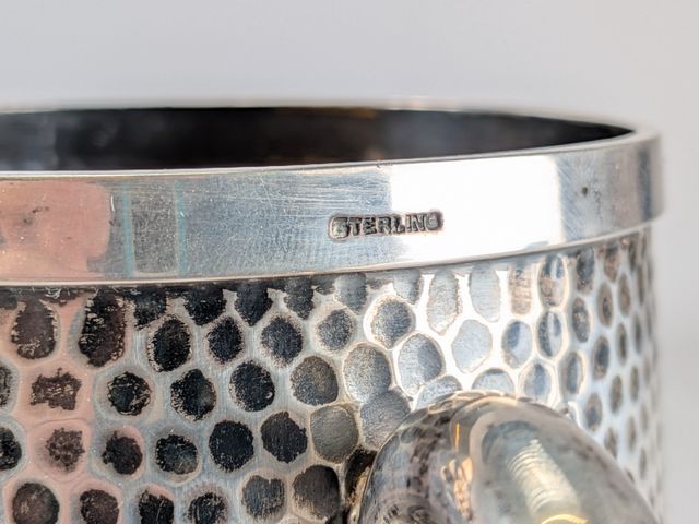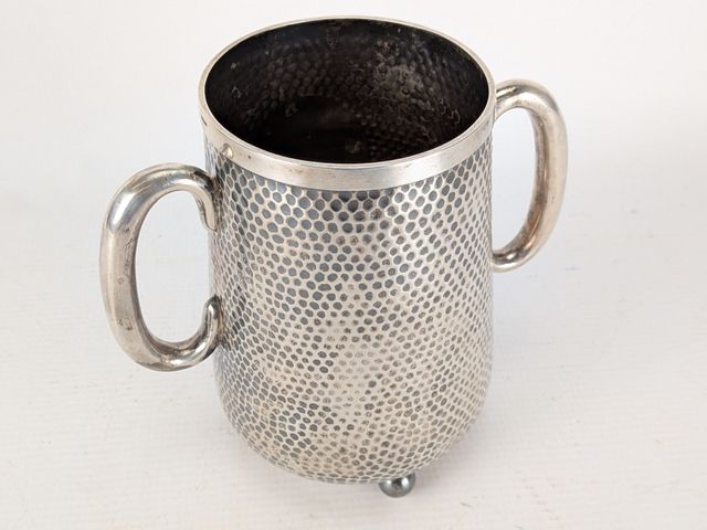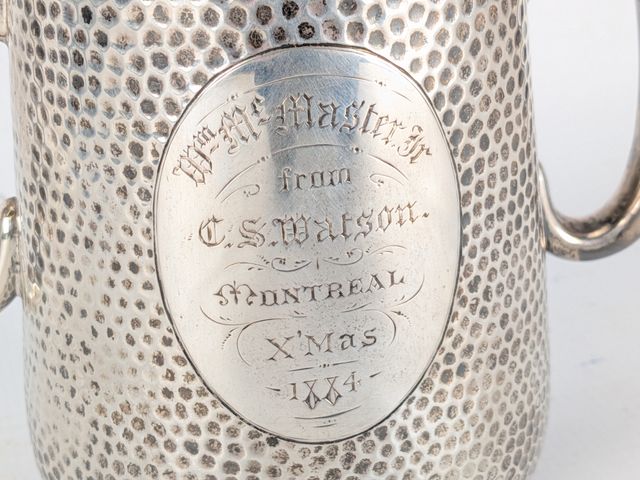 Lot # 175 - Choppe à deux anses en argent martelé – présenté à W MC Master (Sénateur et fondateur de la banque canadienne de commerce) à Noël de 1884 – 480 grammes – 6 pouces de hauteur