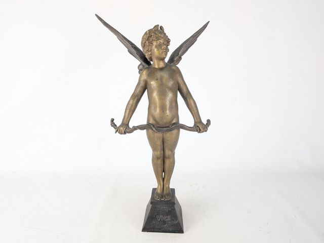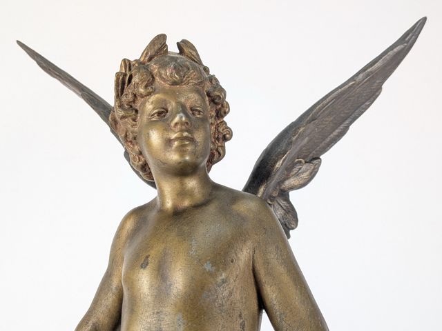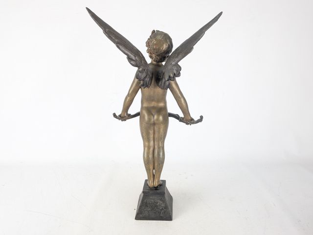 Lot # 218 - Auguste MOREAU - Régule signé à patine de bronze circa 1890 représentant Cupidon, mesurant 17.5 pouces de hauteur avec estampe de la fabrique de Paris.