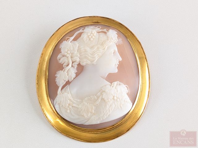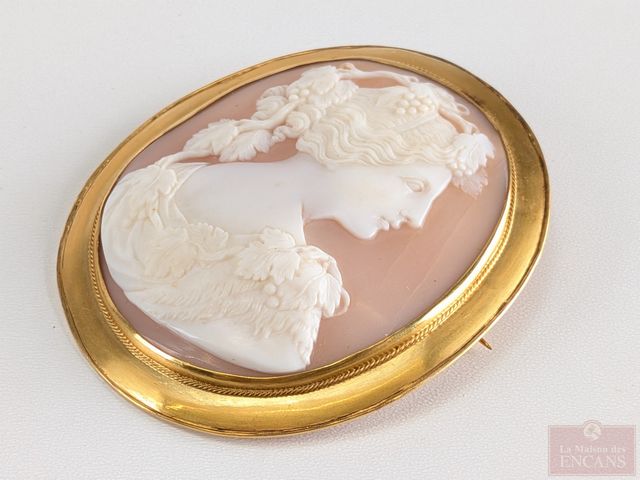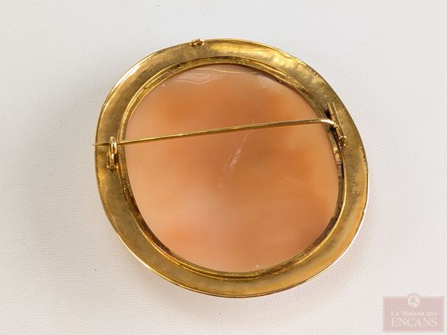 Camée finement sculpté sur coquillage, monté sur broche en or 18k, mesurant 3 pouces de hauteur