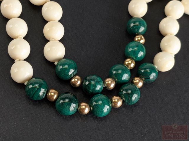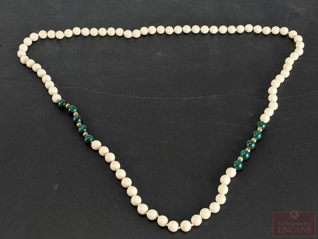 Lot # 204 - Collier de perles d'ivoire et de malachite 8.7mm avec billes en or 14k, circa 1940, mesurant 32 pouces de longueur