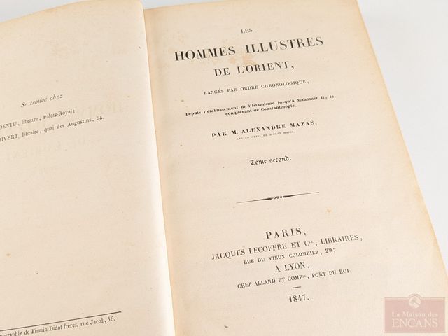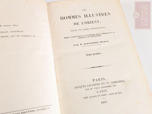 Lot # 114 - Deux livres anciens Hommes illustres de l'orient 1847, édité à Paris par Alexandre Mazas, volumes I et II, parlant de Mahomet, Omar, Mamoun, Saladin, Gengis Khan et autres